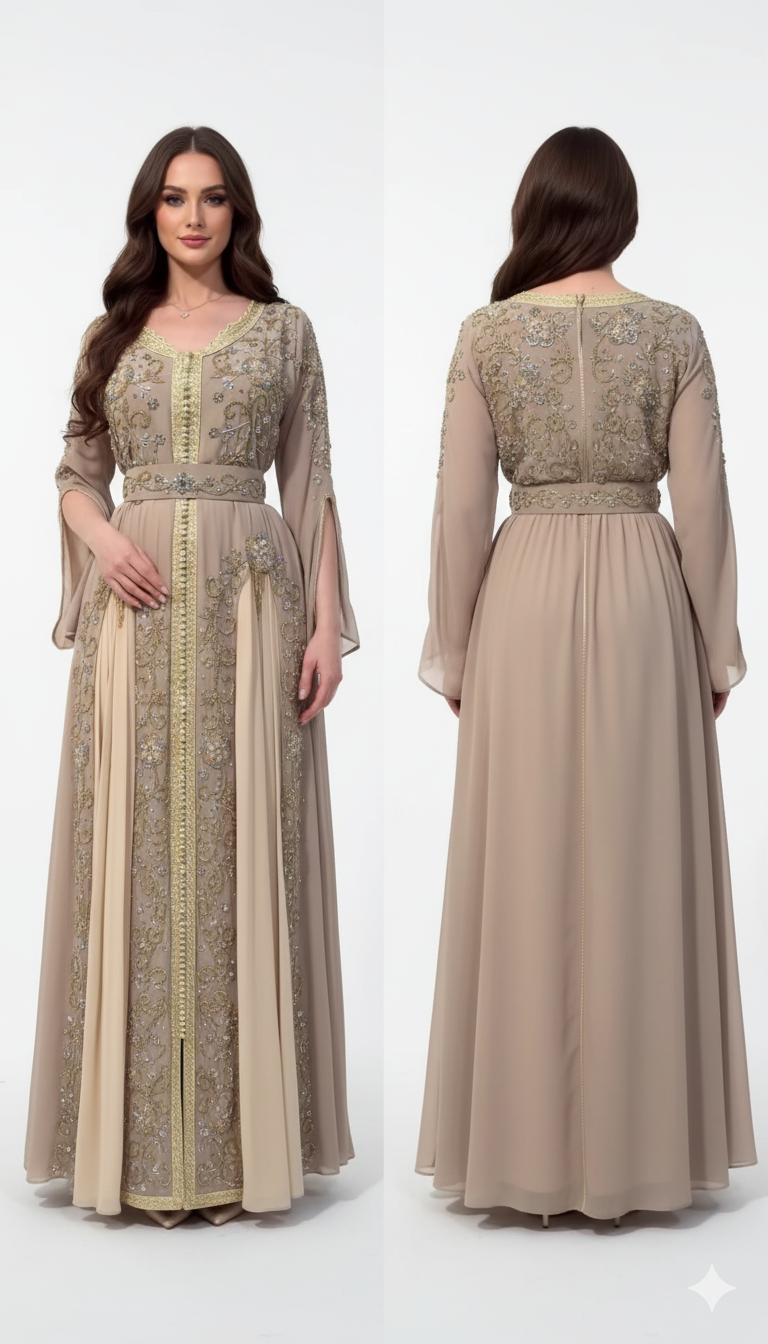 This masterpiece is a tribute to traditional Moroccan craftsmanship, brought to life with contemporary silhouettes that flatter every body type. Its flowing structure, intricate embellishments, and rich color palette make it a timeless outfit that will always stay in style.